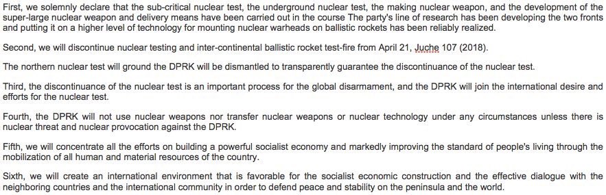 The latest news is a declaration by North Korea about ceasing tests and possibly de-nuclearizing the peninsula.